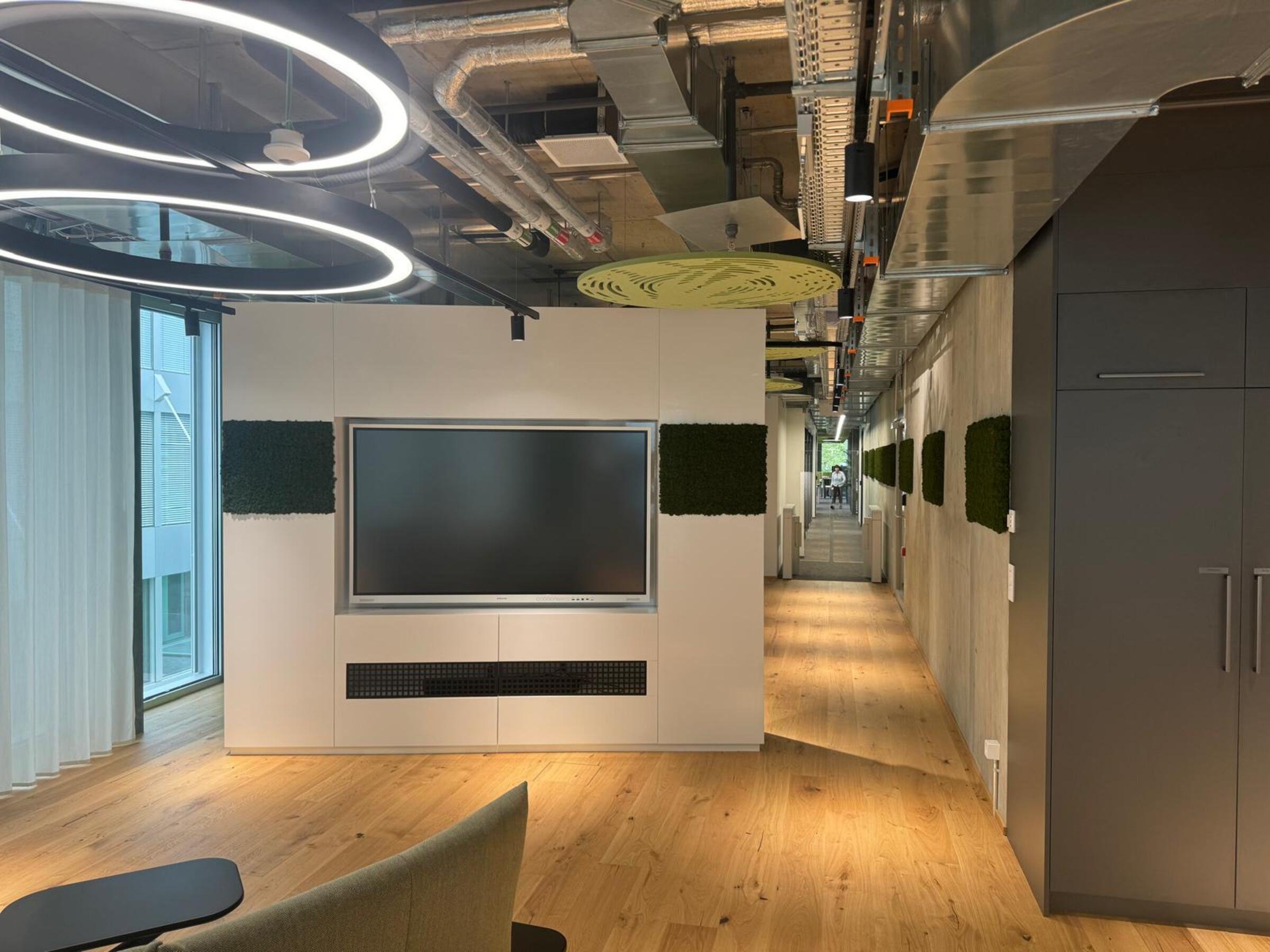 Ein Hersteller von Telekommunikationsgeräten plante die Einrichtung einer neuen Büroetage mit offenen Arbeitsbereichen und Besprechungsräumen, die in ein Nachhaltigkeitskonzept integriert ist. Die Verwendung von Mooswänden und sanften Farben mit grünen Akzenten betont die Ästhetik und erfüllt die funktionalen Anforderungen des Unternehmens, während sie ein angenehmes und umweltfreundliches Arbeitsumfeld schafft.
